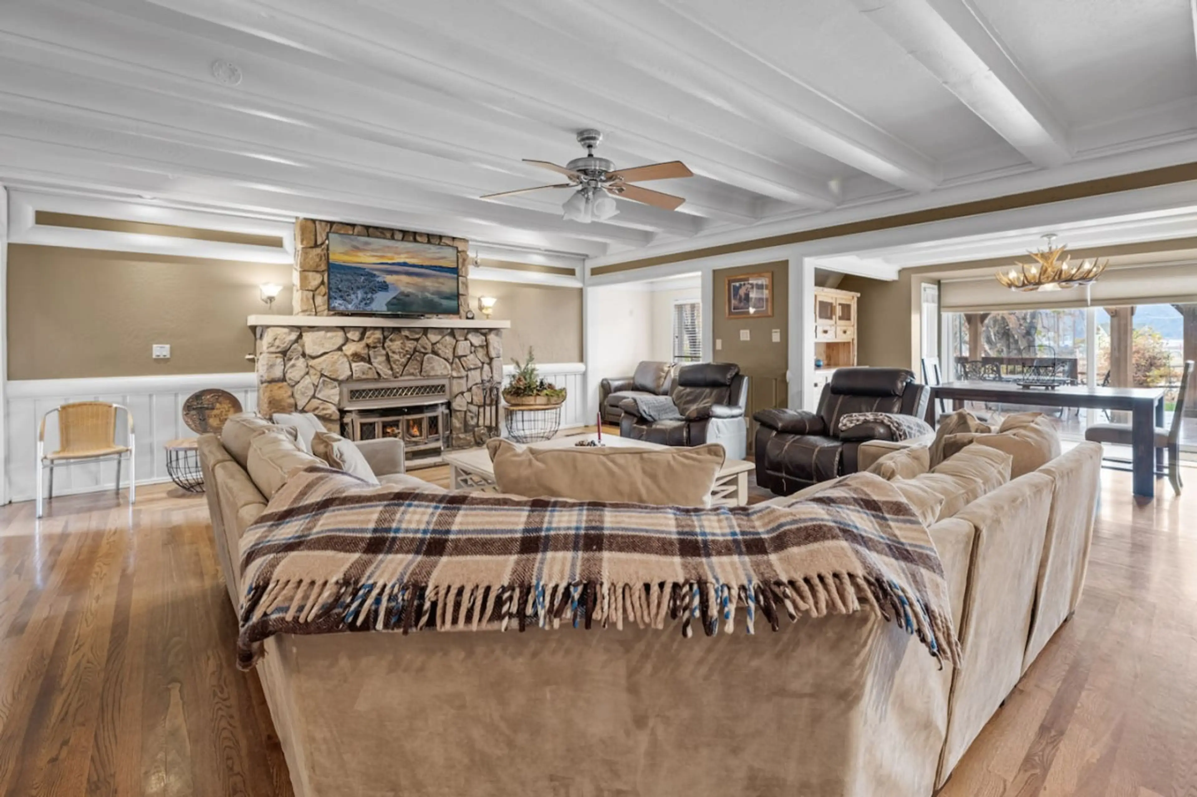 Escape to our "Lakefront Haven" in Eagle Point, where stunning views of Big Bear Lake greet you. - Spacious 4-bedroom home with a loft for up to 10 guests - Cozy living room with a 60-inch smart TV and wood-burning firepit - Game room with pool table and dartboard - Private hot tub and steam...