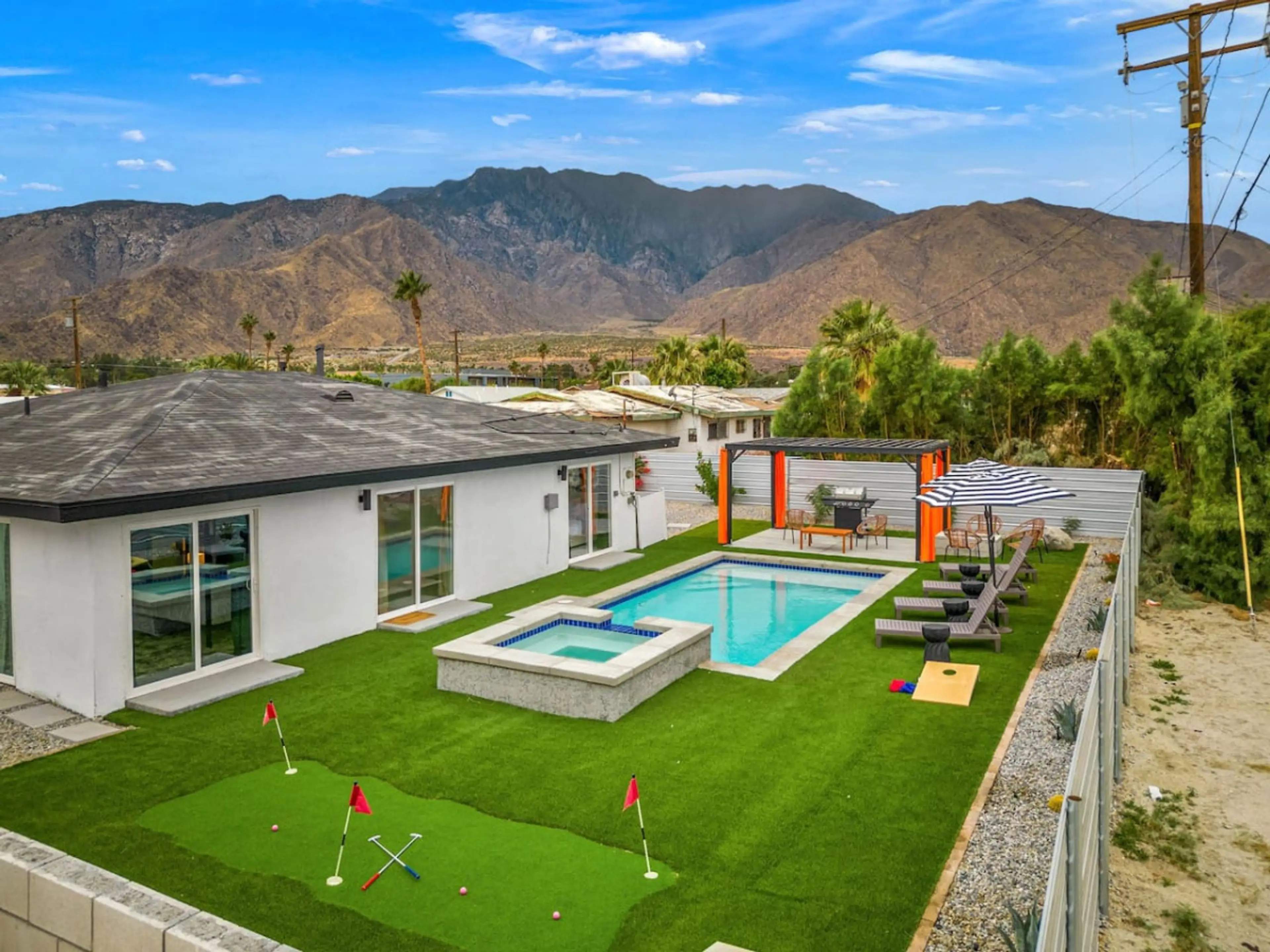 Welcome to our Palm Springs paradise! - Sip Sip Away: a colorful retreat with vibrant decor. - 3 stylish bedrooms, accommodating up to 8 guests. - Enjoy a refreshing pool, hot tub, and firepit under a chic pergola. - Unique putting green and whimsical mural for memorable photos. - Full pro...
