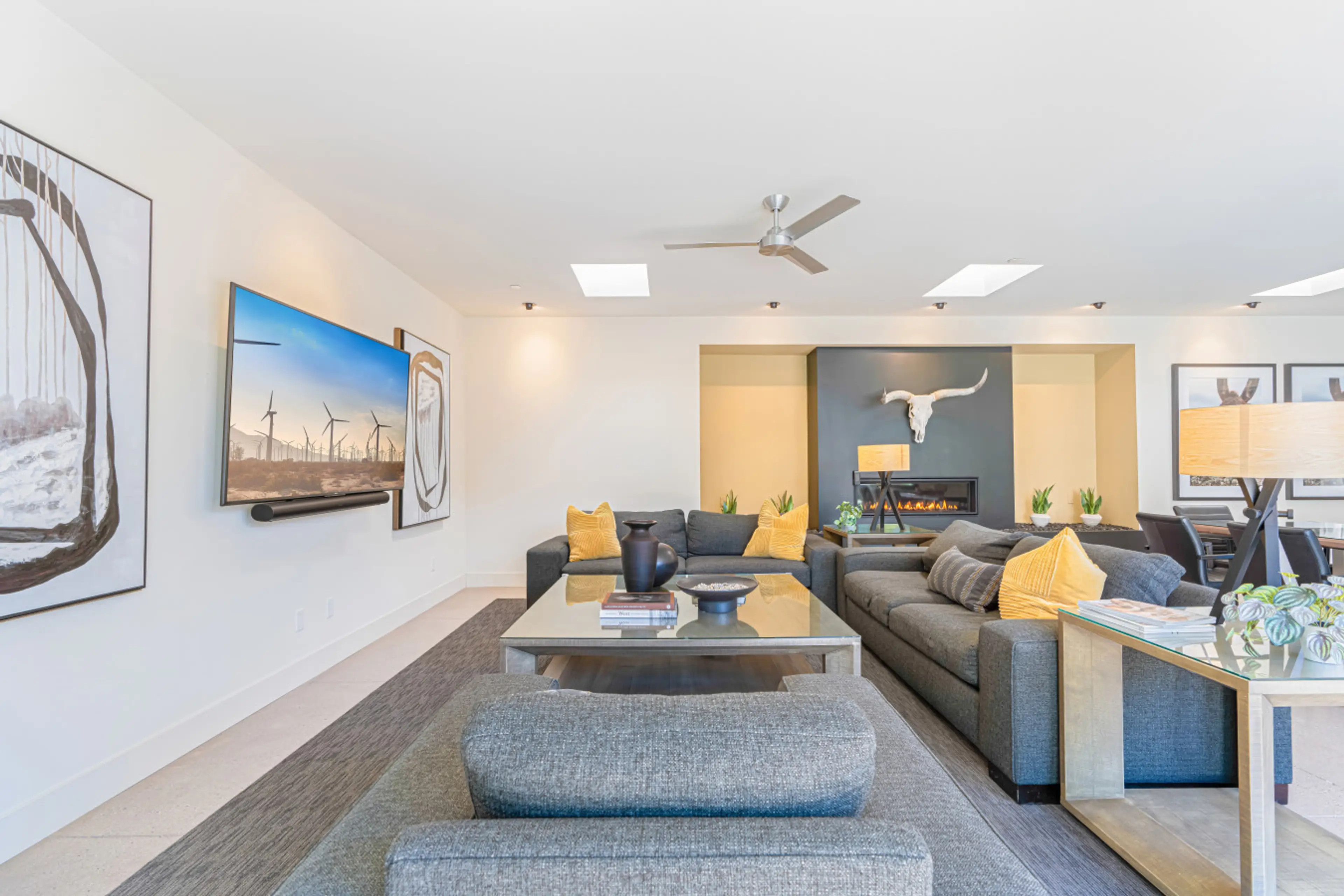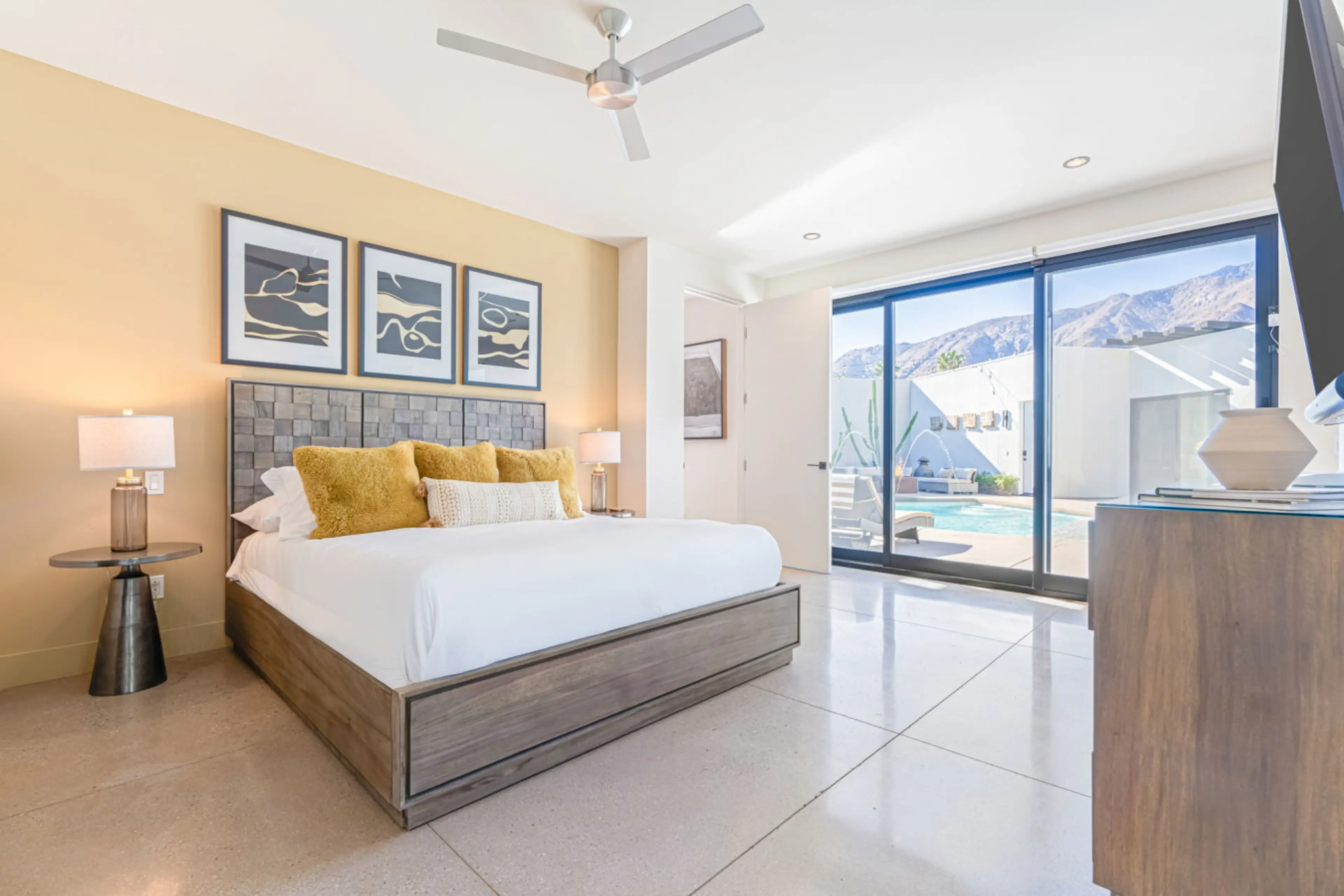 Welcome to your private resort getaway! This modern retreat on a secluded lot in the Historic Racquet Club Estates offers a luxurious blend of indoor and outdoor living. Featuring a stunning triangle-shaped pool and spa, outdoor dining, fire pit, BBQ, and two guest houses, this property is designed ...